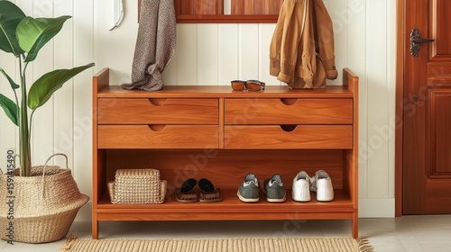 Fototapeta - Wooden shoe cabinet with drawers and a shelf.