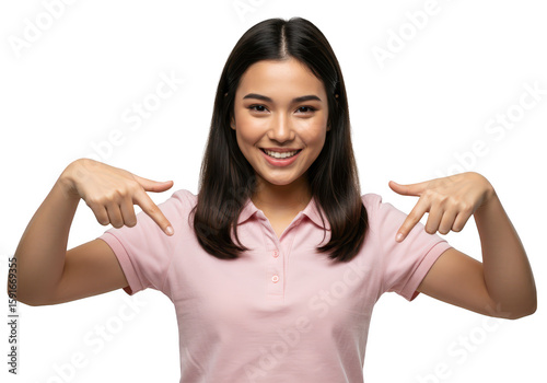 A happy young asian woman smiles and points down with both hands, isolated on transparent background
