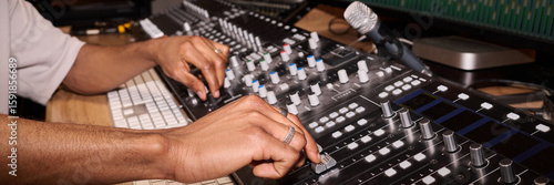>Plakat>Young adult Black man adjusting audio mixing console in recording studio, hands operating sliders and knobs near computer keyboard and microphone, focused on sound engineering