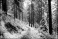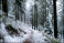 Snow-covered trail winding through a dense pine forest