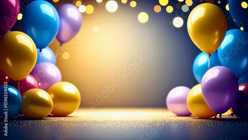 Fototapeta - Kolorowe balony skupione wokół jasnego, świątecznego tła z migoczącym światłem