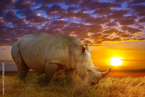 Fototapeta - A rhinoceros grazes peacefully on dry grassland as the sun sets behind vibrant purple and orange clouds on the African savanna.