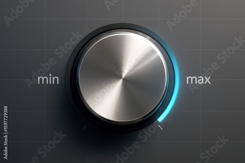 Fototapeta - Sleek metallic knob, glowing cyan, turns towards 'max' on a textured gray surface suggesting precision control in a futuristic audio system.