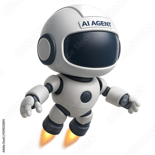 >Plakat>Cute AI agent robot mascot in an astronaut helmet flying with jet boots. 3D render illustration for a tech startup launch or innovation concept, isolated on a white background.