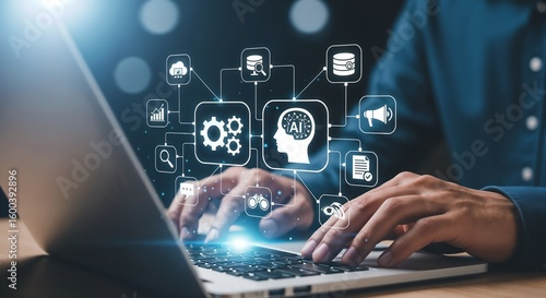 Fototapeta - AI agent and intelligent automation IA technology. Business process automation BPA system. Businessman using laptop computer to give instructions to AI at desk in office.