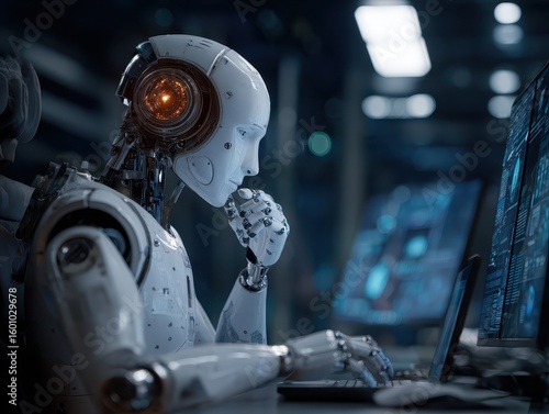 >Plakat>AI agent supporting business processes with automation technology. Generative artificial intelligence analyzing data and predicting future. Businessman using laptop computer.