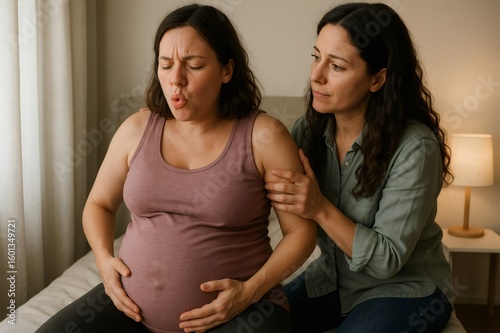Fototapeta - Pregnant woman breathing deeply and cradling her belly, receiving support from her midwife during a serene home labor experience
