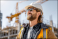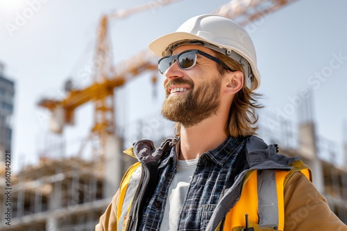 Caucasian male construction worker smiling on site with hard hat and safety gear