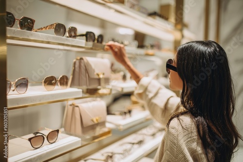 Fototapeta - over-the-shoulder view of woman reaching for sunglasses on shelf in luxury tax-free shop, minimal modern decor, retail travel moment
