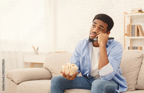 Fototapeta - Nothing interesting on weekend. Boring african-american guy sitting at home with popcorn, expected fascinating film on tv, copy space
