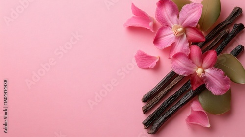 Fototapeta - Vanilla pods and pink orchid blossoms on pink background