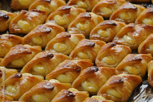 Fototapeta - Full tray of freshly-baked, custard-filled pastry.