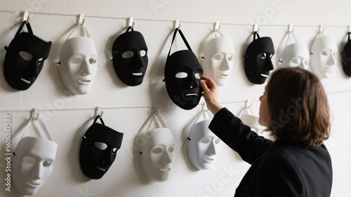 Fototapeta - A faceless person reaching for a mask in a room filled with masks, symbolizing internal conflict and the fear of not being good enough