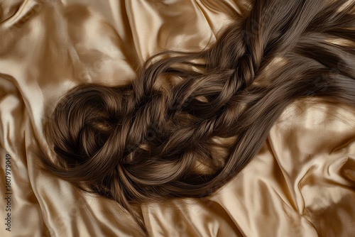 Fototapeta - Close up of a brown braided hair extension resting on a gold satin fabric with soft lighting