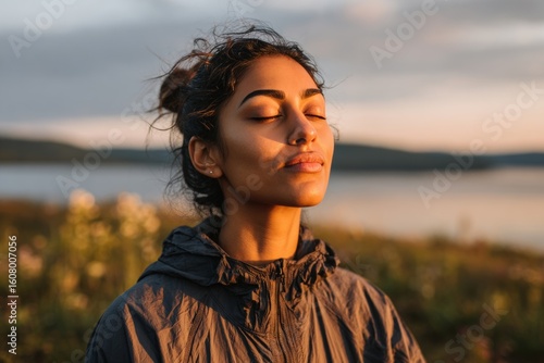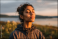 A woman deeply inhales fresh air, experiencing peace and tranquility in nature during golden hour