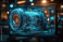 Digital holographic display of futuristic mechanical component with glowing blue and orange circuit details in high-tech environment