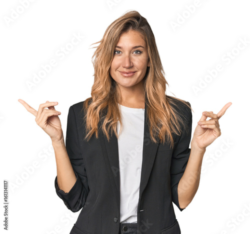 Young businesswoman in a suit pointing to different copy spaces, choosing one of them, showing with finger.
