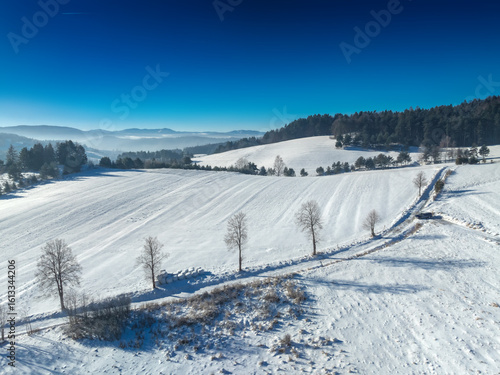 Fototapeta - Lot nad Jastrzębikiem zimą. Lot nad Jastrzębikiem mrożnym rankiem w zimie.