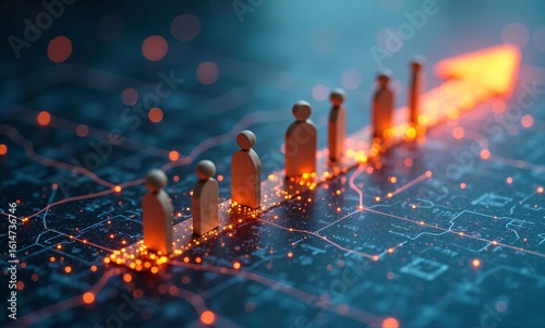 Fototapeta - Wooden figures rise on a glowing digital path, illustrating growth, data-driven progress, and technological advancement.