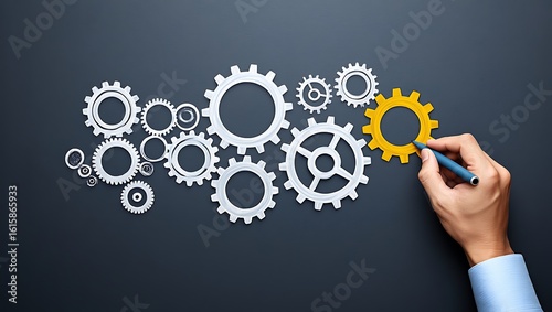 Fototapeta - A hand drawing a yellow gear connecting to a network of white gears on a dark background symbolizing teamwork collaboration and problem solving