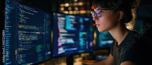 Fototapeta - A focused woman coding intently at multiple computer screens in a dark environment.