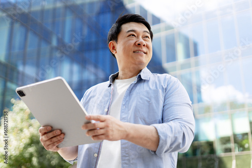 Fototapeta - Asian businessman using tablet and looking up in front of office buildings