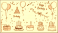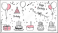 Hand-drawn vector illustration featuring birthday elements like cakes, balloons, party hats, gifts, and confetti for festive celebrations.