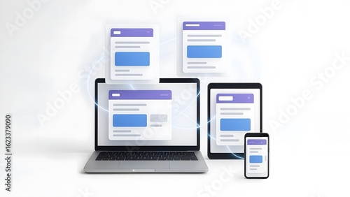 Fototapeta - Synchronized Floating UI Across Laptop, Tablet, and Phone with Glowing Links
