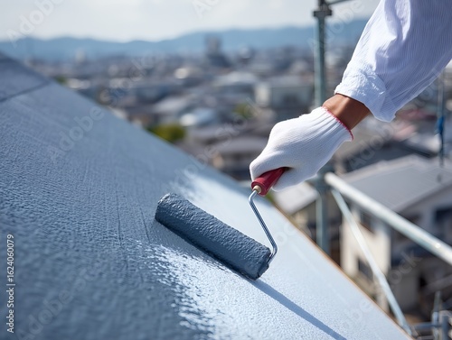 Fototapeta - 屋根をローラーで塗装する作業員の手元