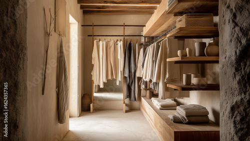 Fototapeta - Garderoba w stylu wabi-sabi – naturalne drewno, proste formy i stonowane kolory tworzą przestrzeń pełną spokoju i harmonii, gdzie piękno niedoskonałości spotyka funkcjonalność.