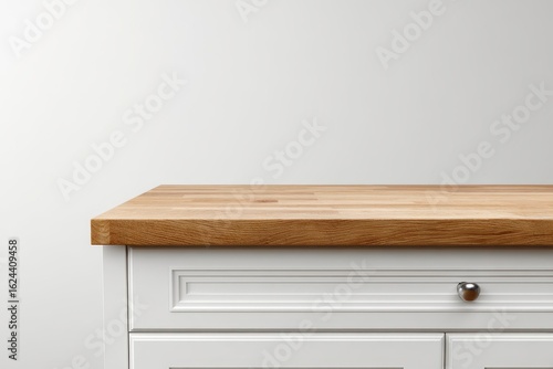 Fototapeta - Close-up of a light-wood countertop on white cabinets