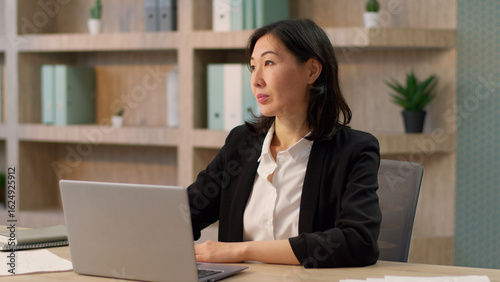 >Plakat>Thoughtful businesswoman Asian adult business person woman leader manager chinese korean girl japanese employer think contemplate female entrepreneur online work office smiling happy looking at camera