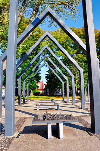 Fototapeta - Ustka - Polska . Symboliczna rekonstrukcja kościoła zburzonego przez sztorm. Nowoczesna konstrukcja metalowa stanowi przykład sztuki geometrycznej w spokojnym otoczeniu parku.