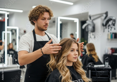 Hairdresser styling clients long blonde hair in modern salon
