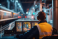Railway dispatcher wearing headphones and high visibility vest managing train traffic from a control room at night