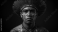 Retrato colorido de indígena jovem com grafismos no rosto e olhar firme sobre fundo escuro dramático Índio Originário
