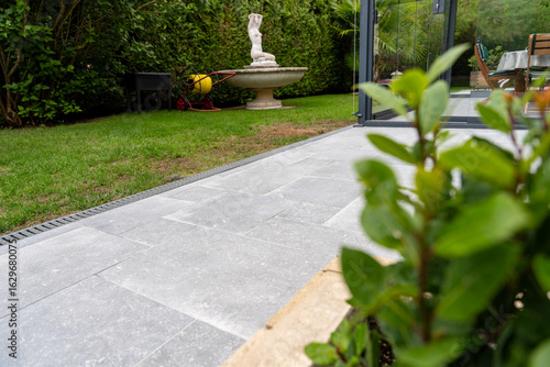 Fototapeta - Terrasse extérieure avec carrelage imitation béton gris clair, design moderne et minimaliste