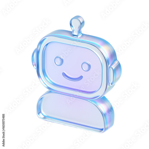 >Plakat>Cute transparent translucent 3d chatbot icon with a friendly expression reminiscent of modern technology and communication, glowing softly in various shades of blue and purple on a clear background