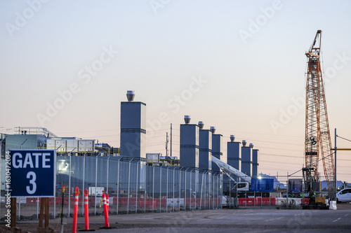 Fototapeta - Data center construction site with fenced perimeter, crane, exhaust stacks, and equipment, showing active development of secure technology infrastructure for computing, storage, and network operations