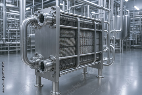 >Plakat>Stainless steel heat exchanger industry setting with pipes and machinery for efficient thermal energy transfer and fluid processing manufacturing