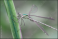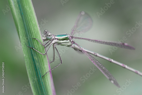 Fototapeta - Delikatna, metaliczna ważka na zielonej łodydze. Piękna fotografia makro symbolizująca spokój i harmonię w naturze.