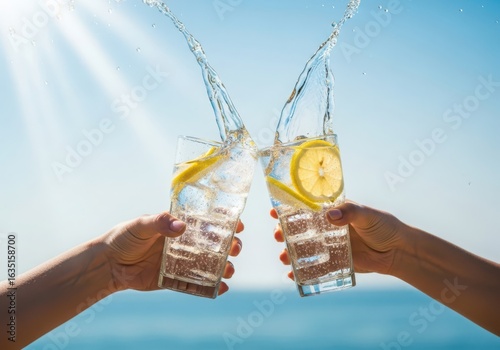 >Plakat>Photo of two hands holding glasses of refreshing lemonade with lemon slices and ice, splashing in the bright sunshine against a blue sky and ocean