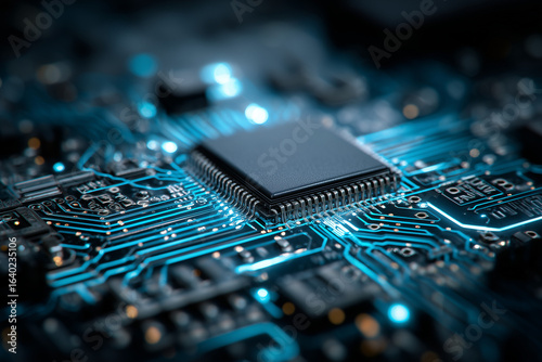 Fototapeta - Close-up of a computer chip on a blue circuit board with glowing light patterns. Concept for artificial intelligence, quantum computing and data processing