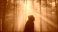 A person stands in a dense forest, looking upward as sunlight filters through tall trees, creating an ethereal, peaceful atmosphere.