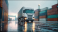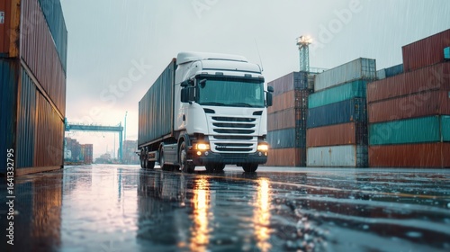 A white semi truck drives on a wet road at a port surrounded by shipping containers. Global cargo transport concept.