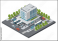 >Plakat>3D isometric illustration of a busy bus station with a modern terminal building, multiple buses parked at platforms, waiting passengers, cars, and surrounding trees