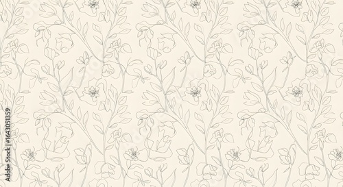 Fototapeta - Delicate floral pattern featuring stylized flowers, leaves, and stems in a light, neutral color palette, creating a soft and elegant design.
