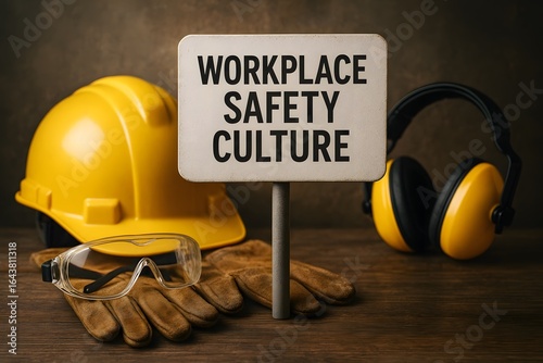An image emphasizing workplace safety culture, with essential safety equipment.