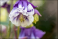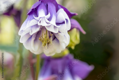 Fototapeta - Wiosną piękny kwiat rozkwitł w ogrodzie przed domem. Zbliżenie na kwiat orlika (Aquilegia) o fioletowo-białych płatkach. Dwuwarstwowe płatki tworzą delikatną, pofalowaną strukturę