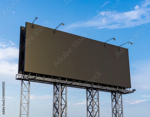 Fototapeta - Blank billboard mockup for outdoor advertising. A large empty digital display screen on a metal structure against a blue sky.